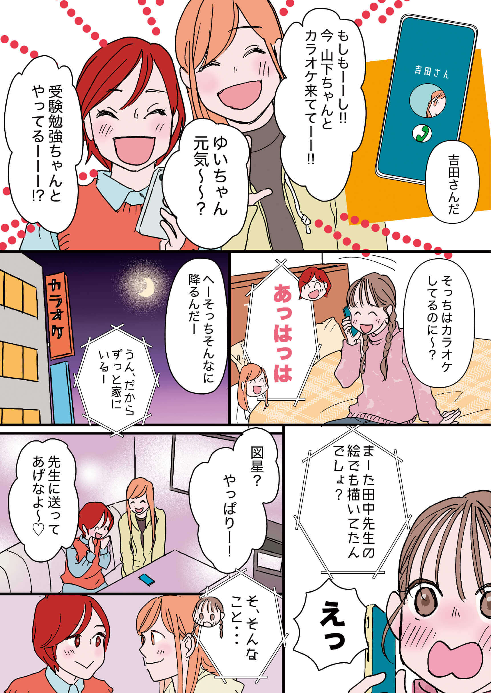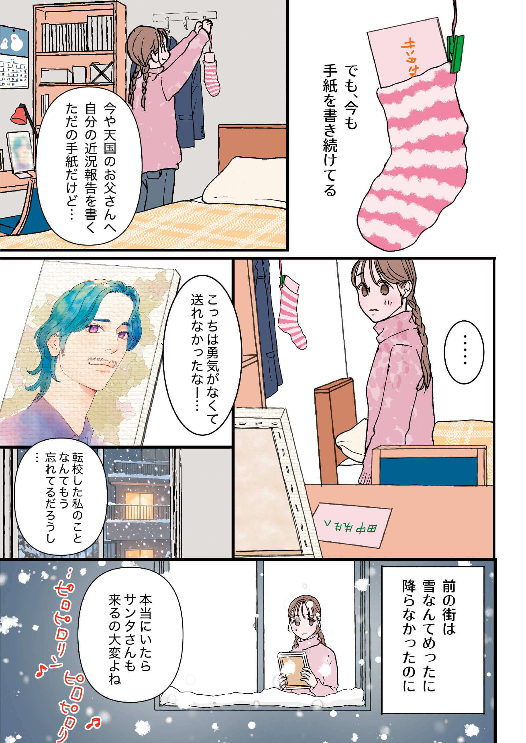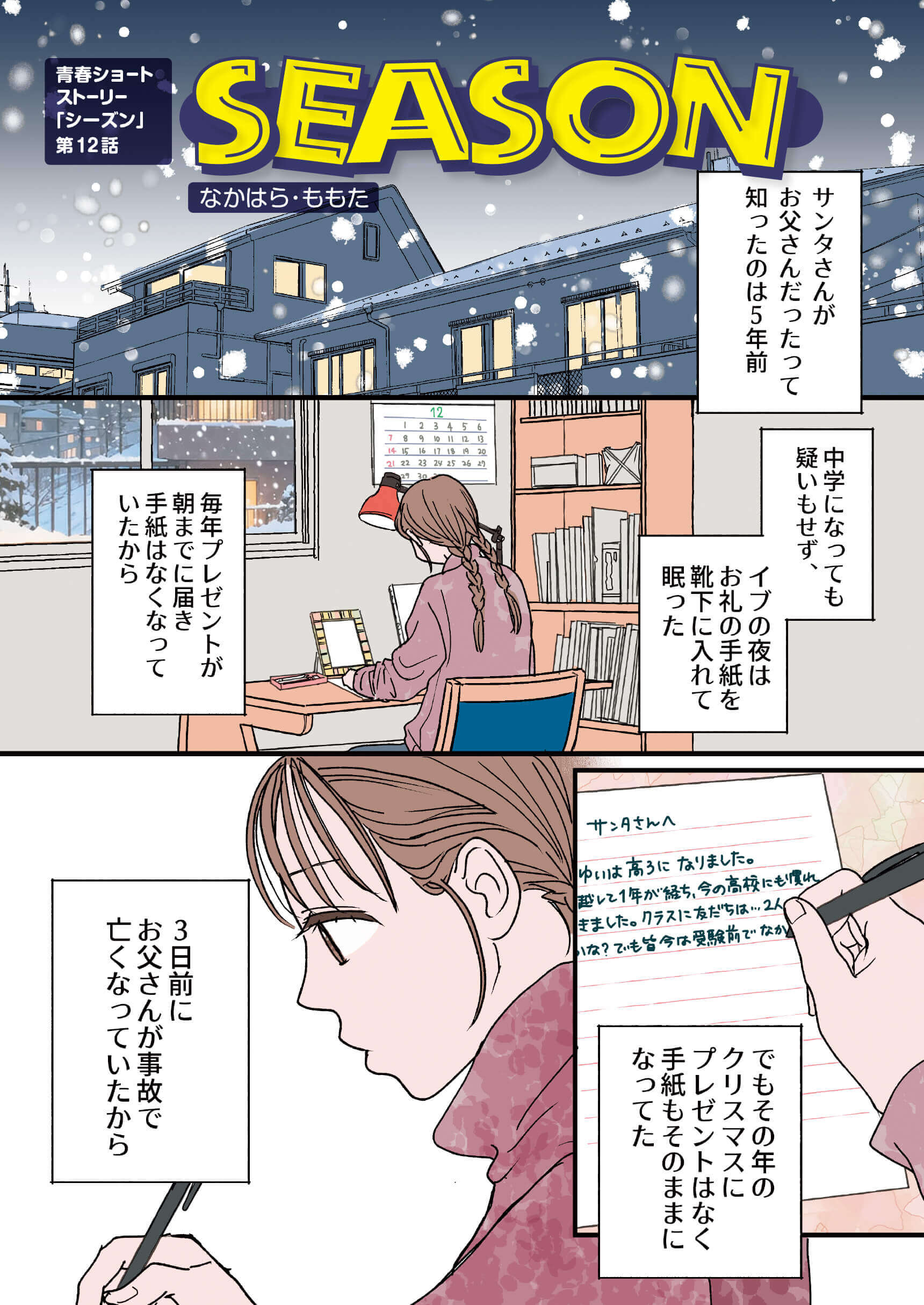 窓の外は雪……。ちょっとせつない始まりになった冬パートの「SEASON」。亡くなったお父さんにあてて、今も手紙を書くゆい。田中先生(転校前の学校の美術部顧問)への思いは、お父さんにつながっていたんですね。ゆいと田中先生の過去エピソードは、「SEASON」第4話、第8話でお読みいただけます。「先生ってサンタクロースに似てますね」。第4話でゆいが先生に言ったセリフがいっそうしみてきます。