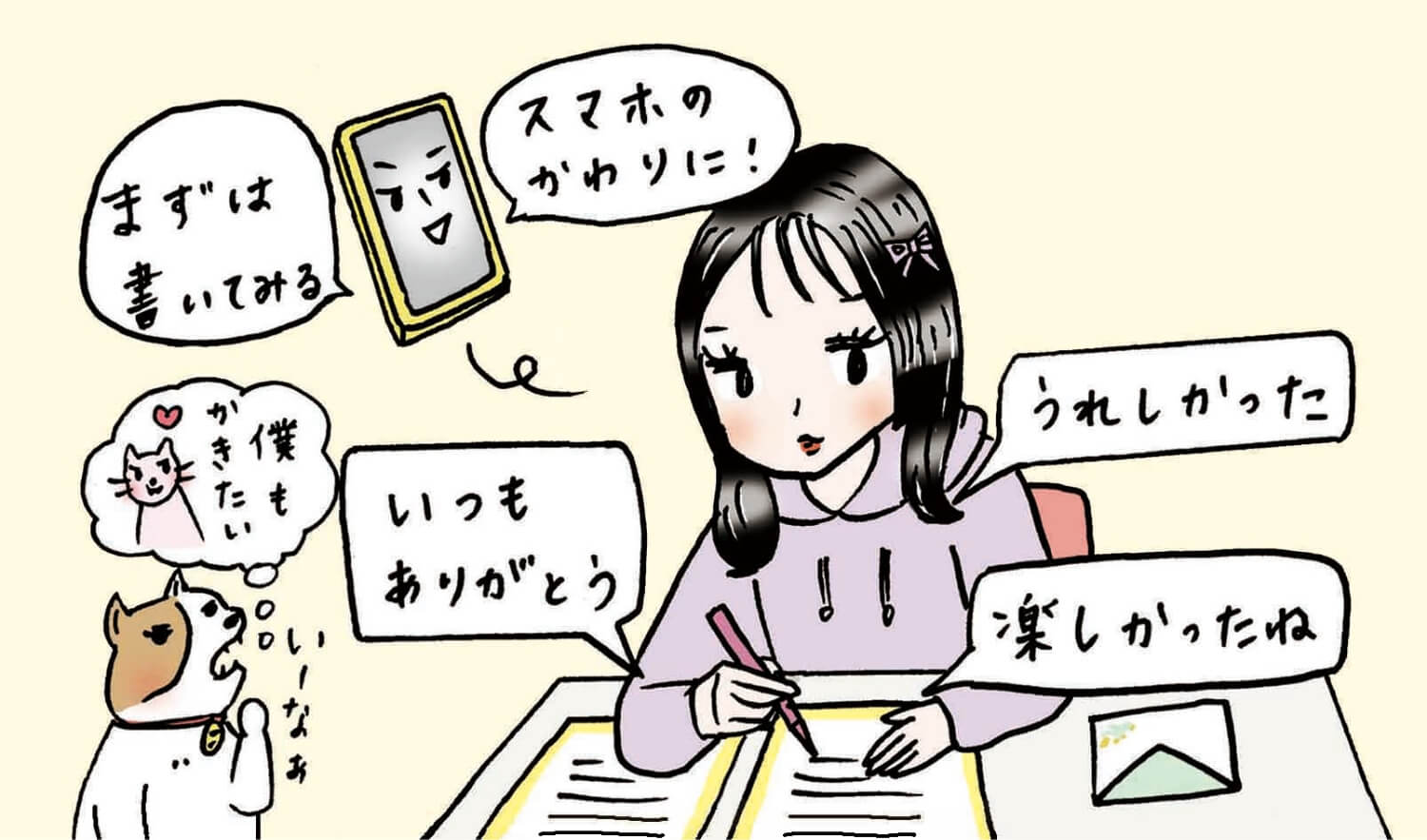 最初は、普段SNSでする言葉のやりとりの場所を、紙の上に移すつもりで書いてみる。すると、知らないうちに自分と対話していたり、スマホに頼らずに言葉を探していたり、意外な面白さがあることに気づくでしょう。