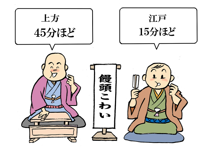 落語には大きく分けて、江戸・東京の「江戸落語」、京・大阪で発展した「上方落語」の二種類があります。それぞれ成り立ちや演出の仕方に違いがあり、江戸落語と上方落語では同じ噺がまるで違う作品になることがあります。「饅頭こわい」もその一つ。江戸落語の場合は、あらすじ通りで15分ほどの短い噺ですが、上方落語では怪談話がはさみこまれて、45分前後の大ネタへと変化します。そのため、関東では落語家になりたての前座が、上方ではベテランの落語家(上方では真打ち制度がありません)が演じることが多くなっています。
