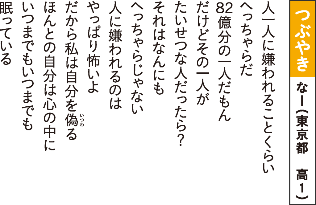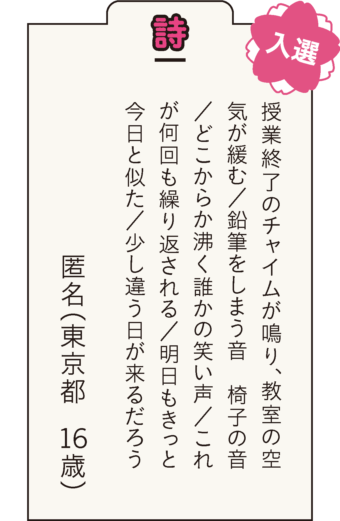 [評]教室のようすを客観的に描くことで距離感を出しています。日常の倦怠感を表しつつ結びには希望があります。