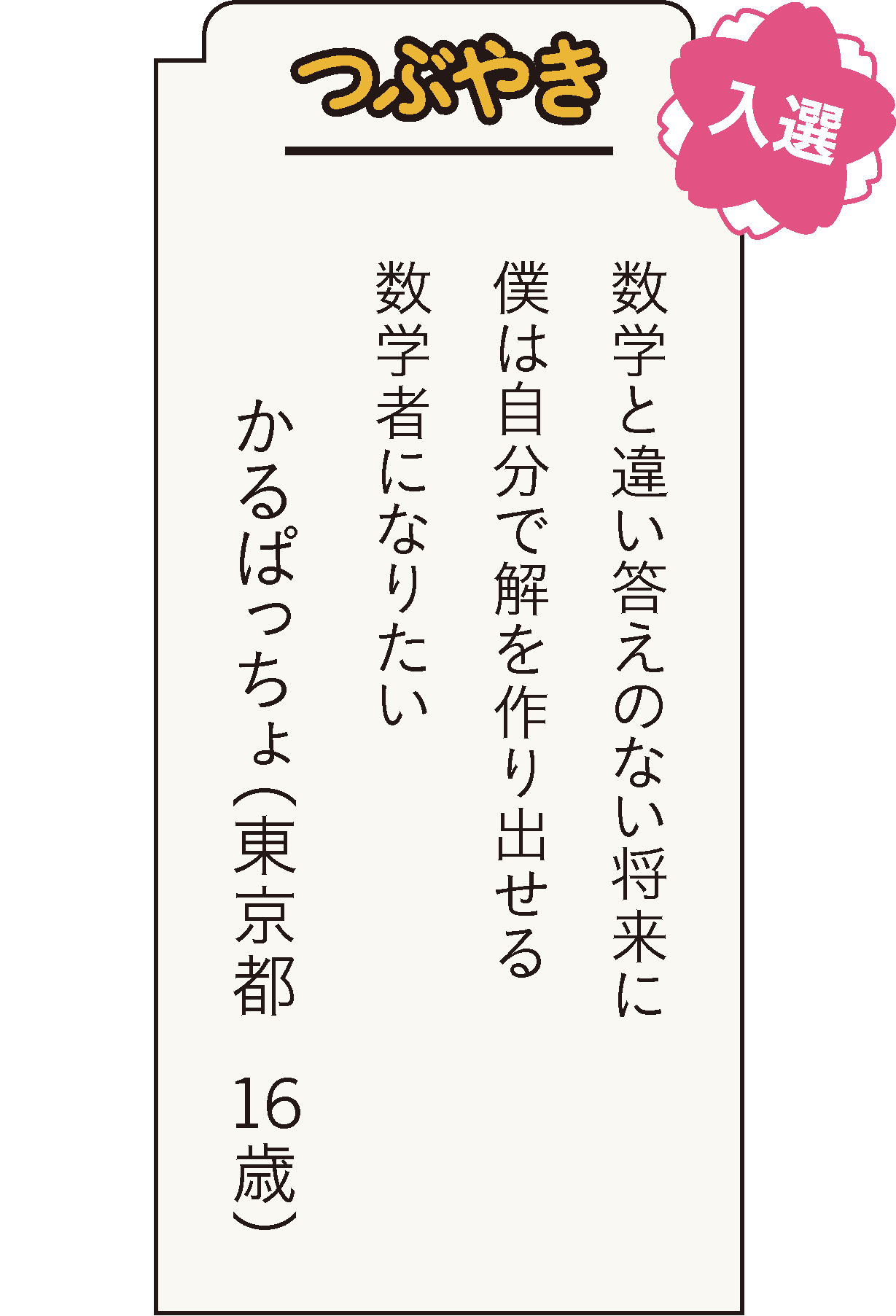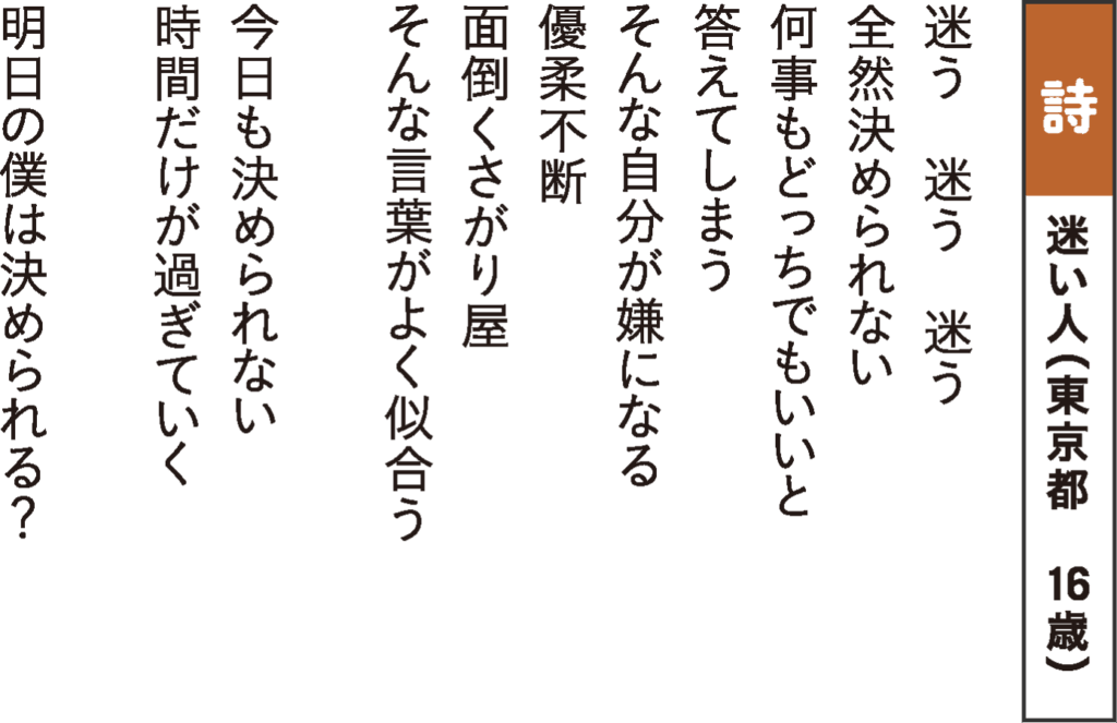 [評]模索しながら進んでいく意志を静かな調子で述べています。「答え」「解」などの言葉選びも行き届いています。