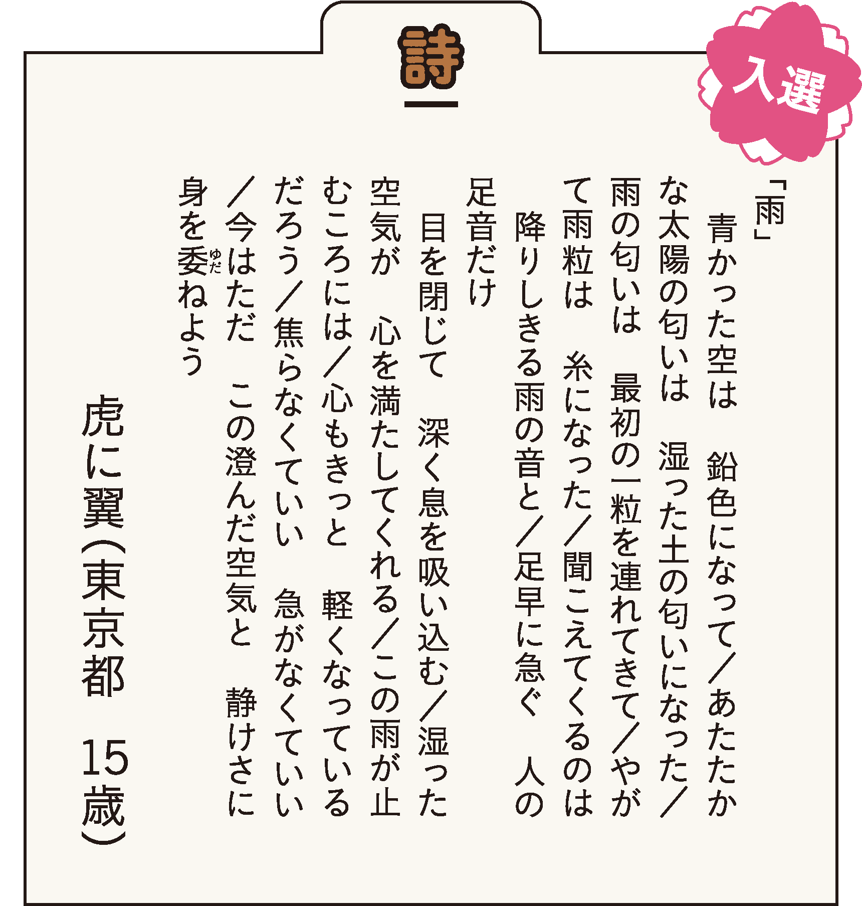 [評]作品に流れる時間のゆるやかさと、五感にふれる描写とにより、読者が作者の心情に無理なく一体化できます。